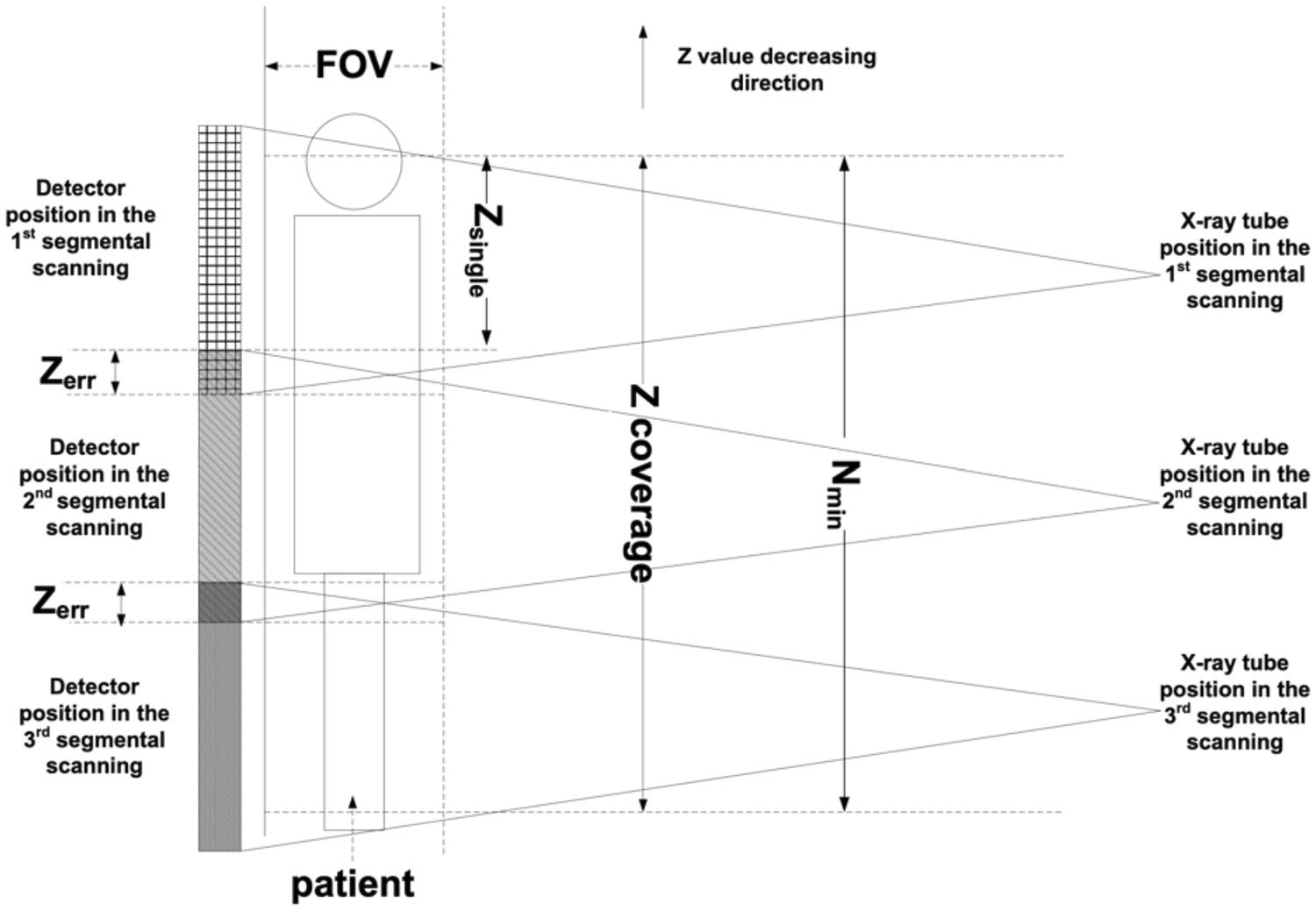 在这篇研究成果中指出,WR-3D技术即引入一种新颖的成像方法,可以生成整个脊柱的大覆盖范围、负重位三维图像。该技术利用的是Cone Beam锥束成像技术,这项技术不同于扇形束成像,具有更好的Z轴分辨率。WR-3D设计了非等中心的锥束CT扫描,以便让扫描具有更大的FOV。在扫描过程中X射线管和平板探测器保持不动,患者站立于旋转站台,通过旋转站台电动旋转带动患者进行低速旋转一圈,以实现不同角度的数据采集,并通过三维重建算法,重建出患者扫描部位的三维空间影像。