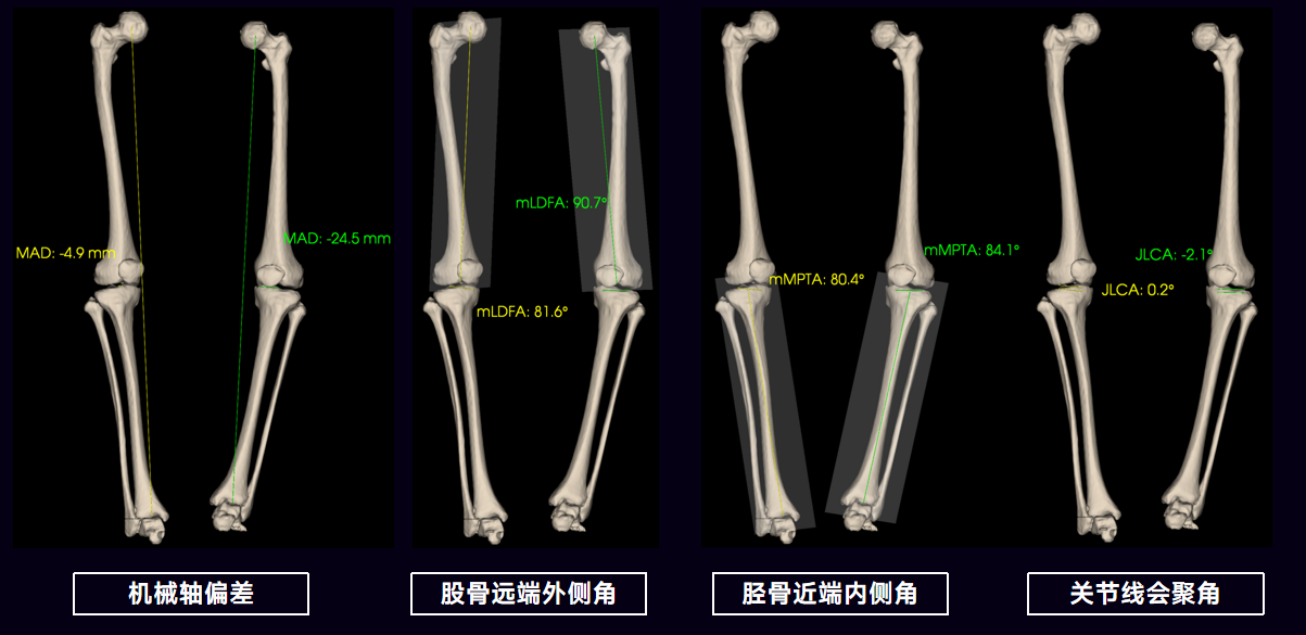 与此同时,WR-3D技术搭载的AI自动测量系统在膝关节诊疗中能够完成关节线会聚角、膝关节间隙、髁间窝宽度/高度等参数的自动测量,并能提供股骨远端外侧角、胫骨近端内侧角、关节线会聚角、机械轴偏差等参数。为医生提供更加全面的骨骼信息,为患者保守治疗和手术治疗提供了精准的数据支撑,有效补位CT和MR。