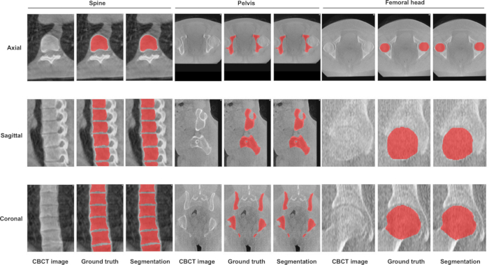 随后,研究人员通过医学图像软件对脊柱、骨盆和股骨头进行多视图人工标注,形成模型训练所需的准确样本数据。深度学习模型采用目前主流的三维U-Net架构,通过残差连接和注意力模块增强了模型的特征学习能力。通过500轮训练迭代,模型不断优化自身参数,最终可自动识别CBCT影像中各关键解剖区域,并输出结构清晰的三维分割结果。