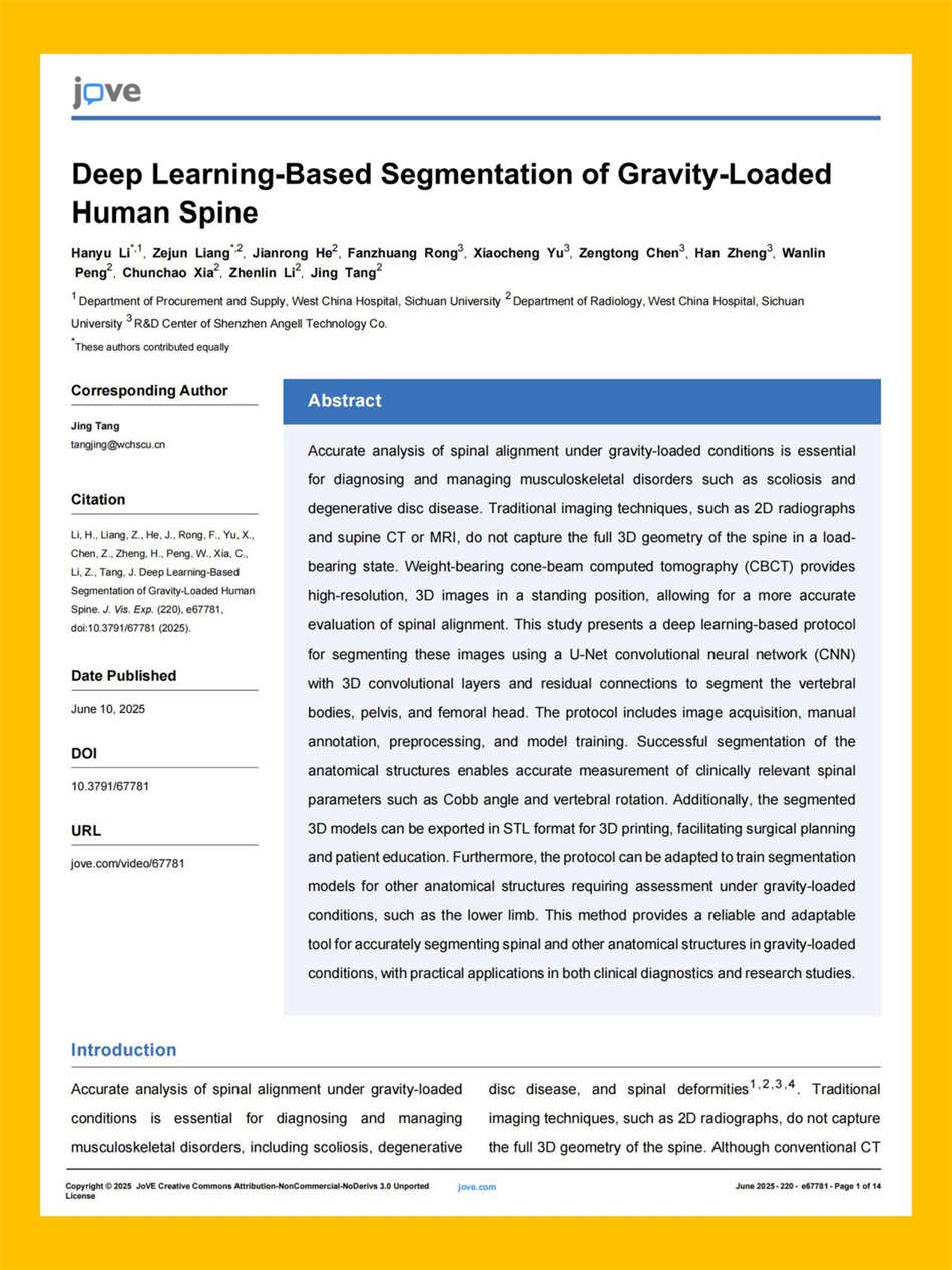 研究成果发表于国际知名科研期刊 JoVE(Journal of Visualized Experiments)。JoVE 是世界首个结合视频演示与学术出版的期刊,致力于通过影像形式呈现生物学、医学、化学、物理等领域的研究过程与成果。该期刊通过多形式的展现方式,提升科研工作的可重复性和传播性,广泛应用于教学、研究和临床培训。本研究通过JoVE展示了基于深度学习和负重锥束CT技术的脊柱、骨盆等部位的自动分割和测量流程,进一步促进了智能影像分析在精准医学中的应用。