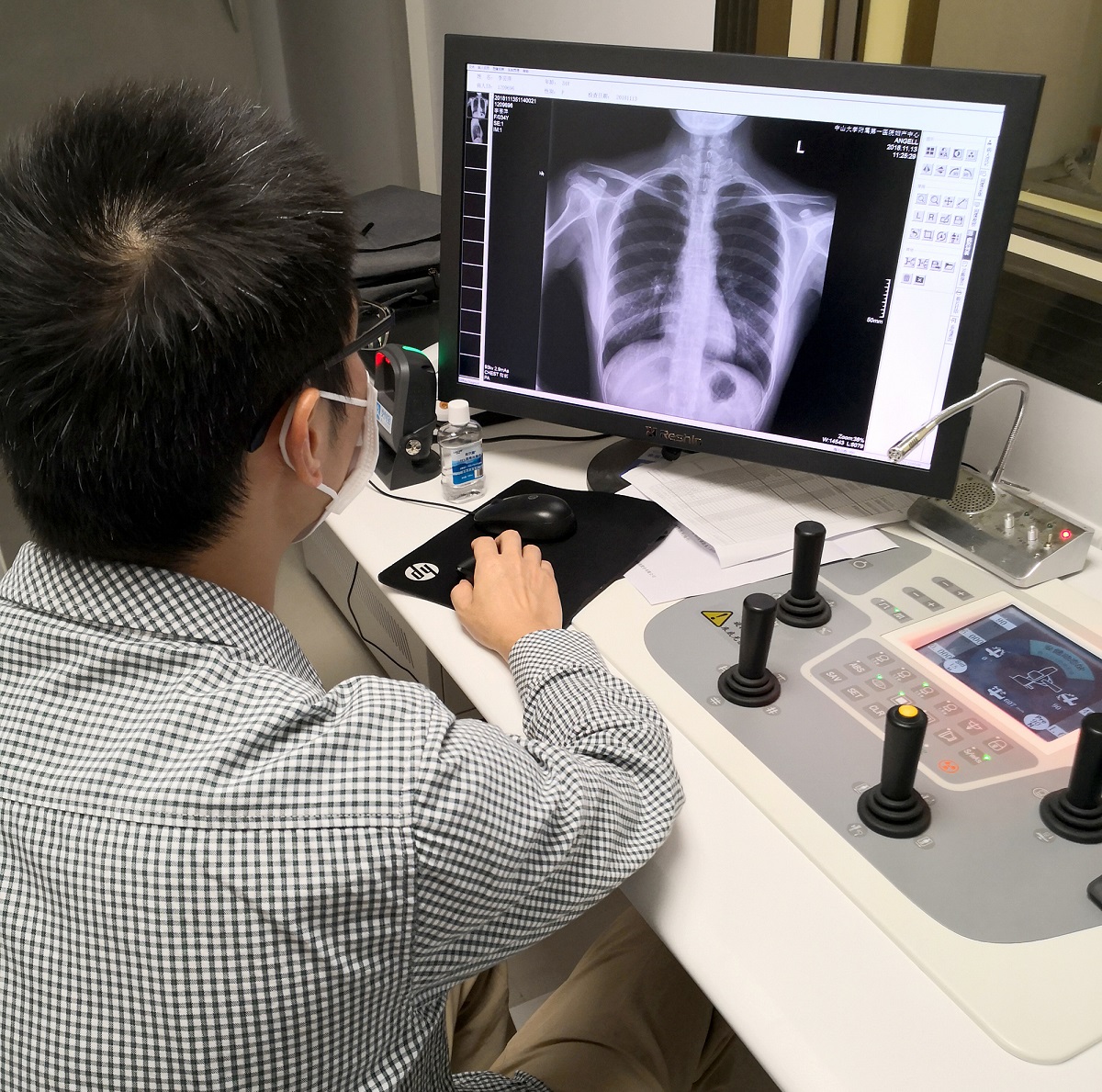 中山大学附属第一医院(简称中山一院)医学影像科DR操作室内,放射技师清晰的摆位提示音,透过语音通话系统准确传导到患者。伴随着放射技师轻轻按下曝光手闸,DR设备呼出一声清脆的“滴”音,3秒后,一张清晰的X光胸片跃然于屏幕上。